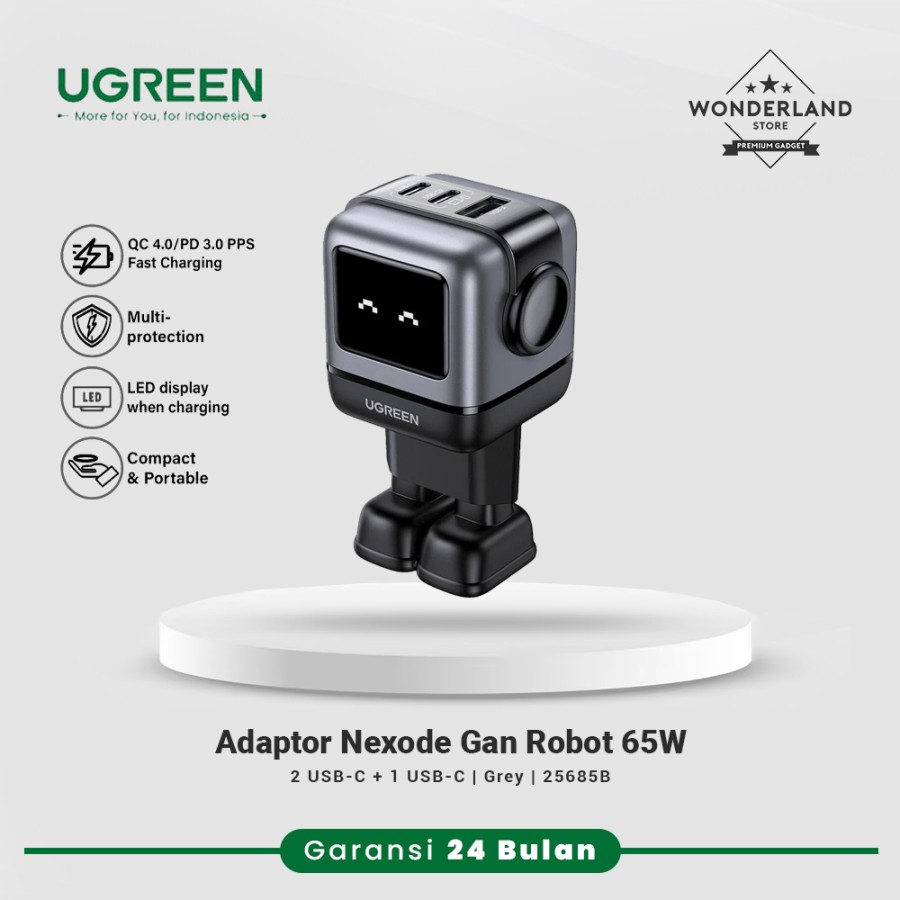 Ugreen Robot Adaptor 65W Charger Nexode Gan PD3.0 PPS QC4.0 SFC SFC2.0 Super Fast Charging with LED Display – Grey